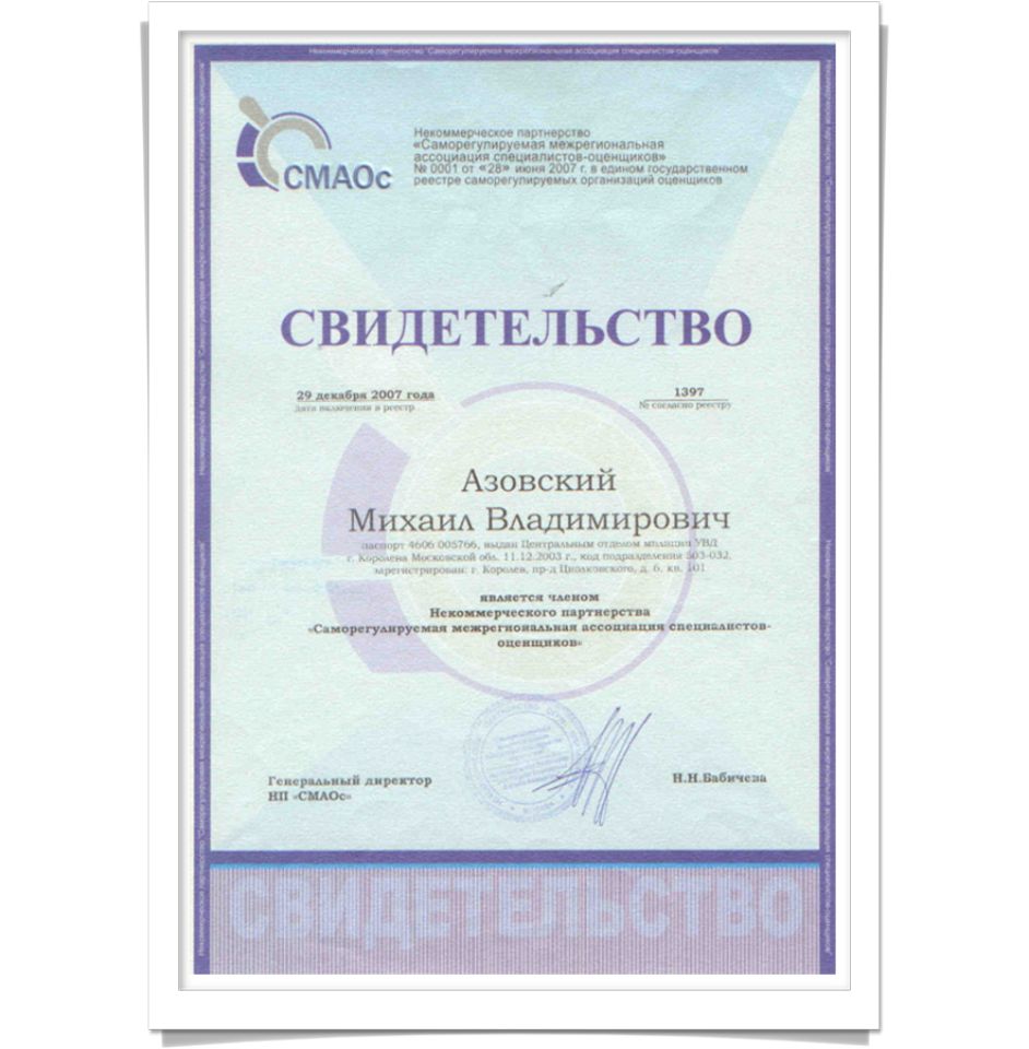 Член в саморегулируемой организации Некоммерческое партнёрство «Саморегулируемая межрегиональная ассоциация специалистов-оценщиков», номер в реестре 1397.