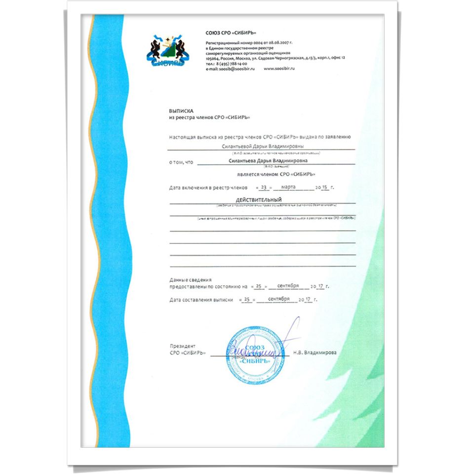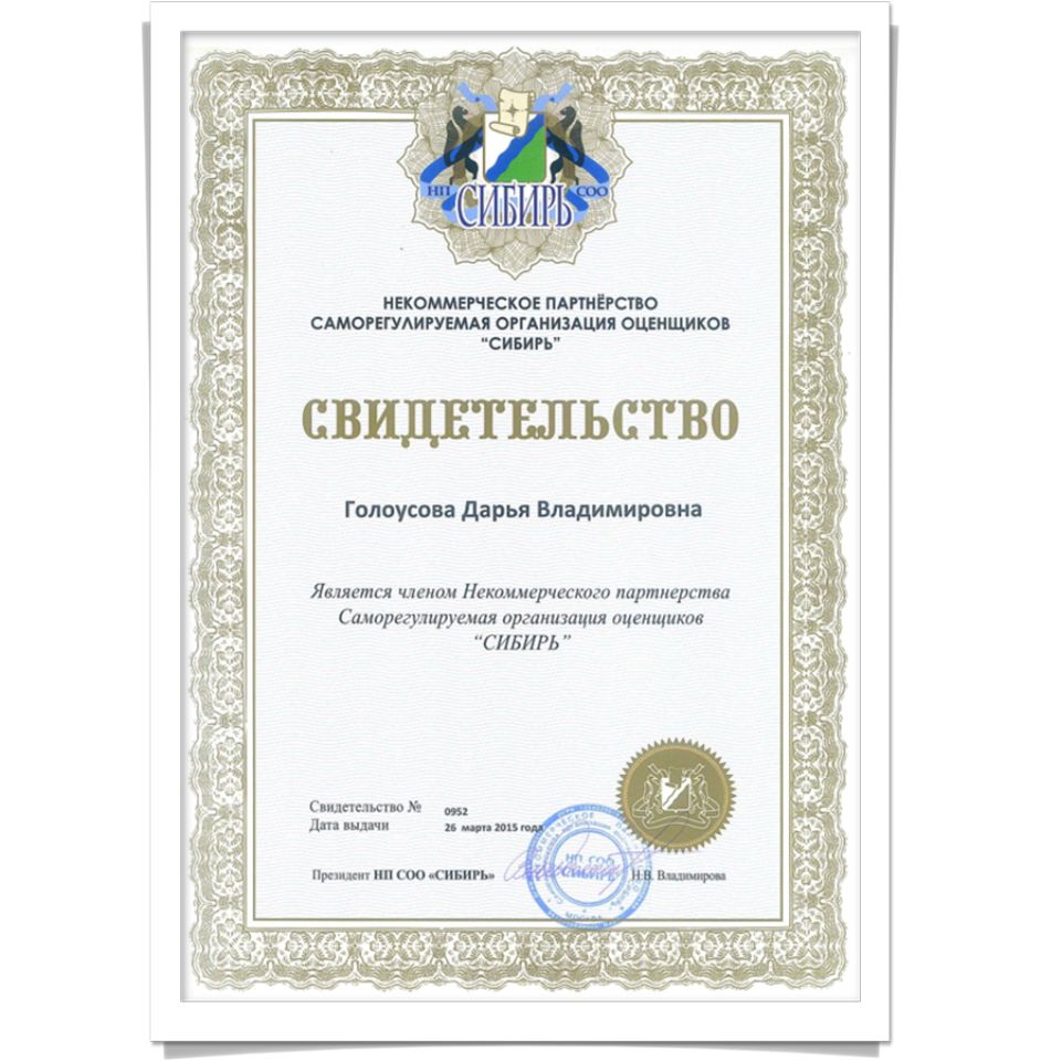 Член СО СРО «Сибирь» (105062, г. Москва, Фурманный переулок, 9) с 2015 года. Свидетельство № 0952 от 26.03.2015, включена в реестр оценщиков за регистрационным № 1222.